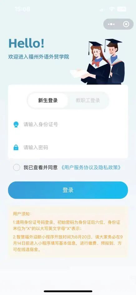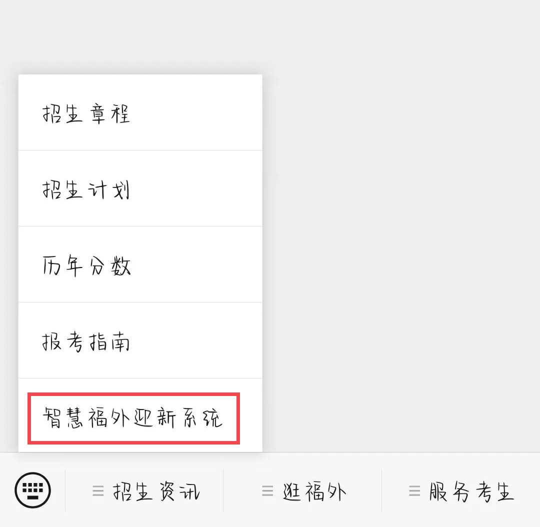 长按扫描二维码关注“福外招生”微信公众号,进入公众号后点击左下角“智慧福外迎新系统”即可进入小程序。