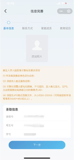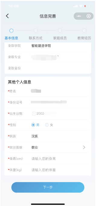 输入个人基本信息,联系方式,家庭成员,教育经历等信息,确认无误后,点击下一步完成填写。