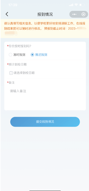 如果有推迟/取消报到的,点击推迟报到、预计到校日期和原因。确定无误后,点击提交报到情况完成环节办理。报到时,请出示“现场报到二维码”,辅导员扫码确认后完成报到流程。
