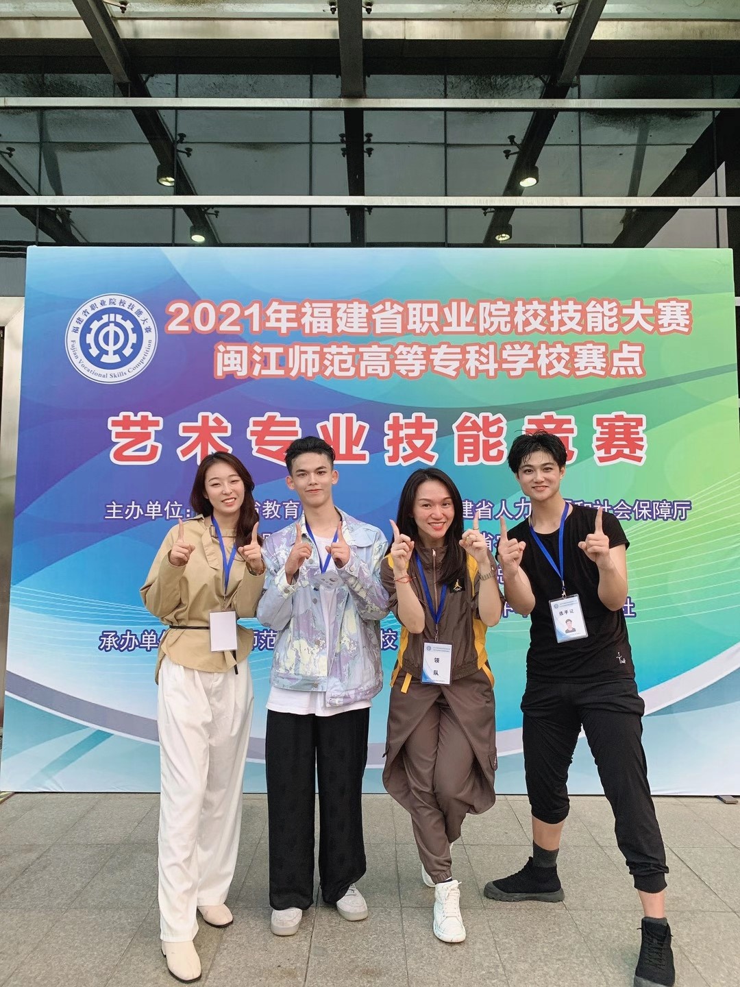 3月31日--4月2日,在厦门演艺职业学院舞蹈系副主任王佳佳老师和岳子涵老师的带领下,2019级舞蹈男班李论,蒋泽龙两名学生参加在闽江师专举行的2021年福建省职业院校技能大赛高职组中国舞表演比赛,分别荣获一金一银的优异成绩。本次大赛共分为两个环节。第一环节为剧目表演与技术技巧展示,我校选手扎实的基本功、精湛的表演赢得了阵阵热烈的掌声。第二环节为舞蹈编创和编创答辩环节。在该环节中,我校学生表现出色,在短短不到2分钟的舞蹈编创环节里两位选手不仅动作完整而且风格准确,表演热情,在编创答辩环节中台风大方、反应敏锐、口头表达思路清晰、赢得了专家评委的一致肯定及好评。