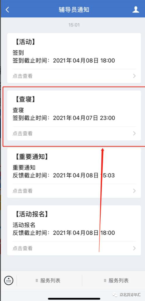 当老师发布了任务后,如:信息收集、签到、查寝、通知等,您会在企业微信“消息”界面中收到消息提醒,点击该消息即可进入任务界面,您也可以在企业微信首页下方“工作台”中找到“辅导员通知”-“服务列表”找到对应任务并点击进入。