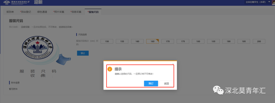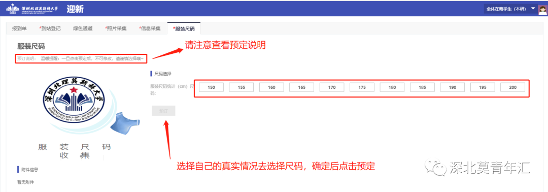 点击“服装尺码”菜单,选择合适的尺码选择,点击“预定”。后续学校会根据该服装尺码购置学生服装。请确认选择的尺码,一旦预定不可修改。