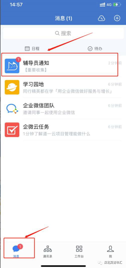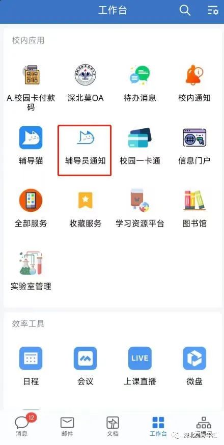 首次使用辅导猫可通过打开企业微信,点击工作台,点击“辅导员通知”应用。