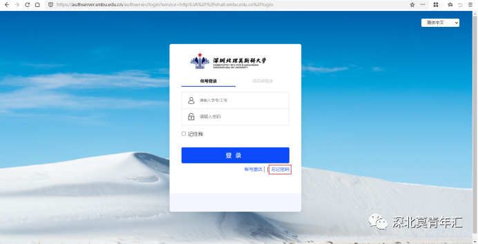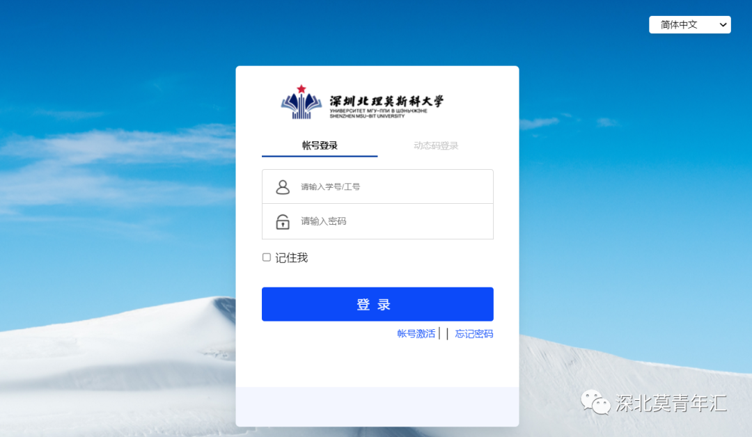 进入网上服务办事大厅:https://ehall.smbu.edu.cn,进入统一身份认证系统,输入本人账号和密码即可进入网上办事大厅。登录界面右上方,可选择登录语言。目前支持“简体