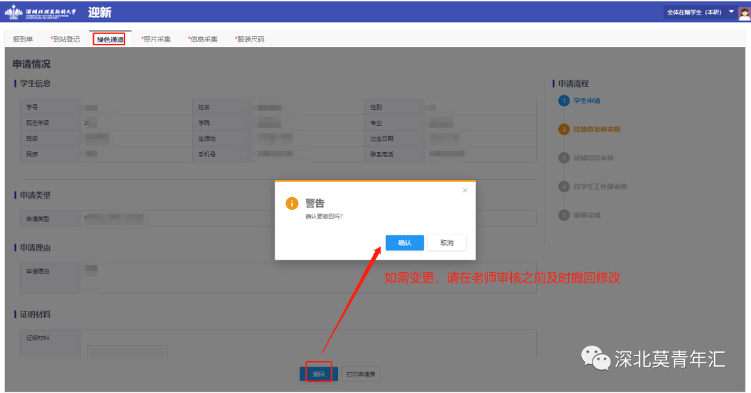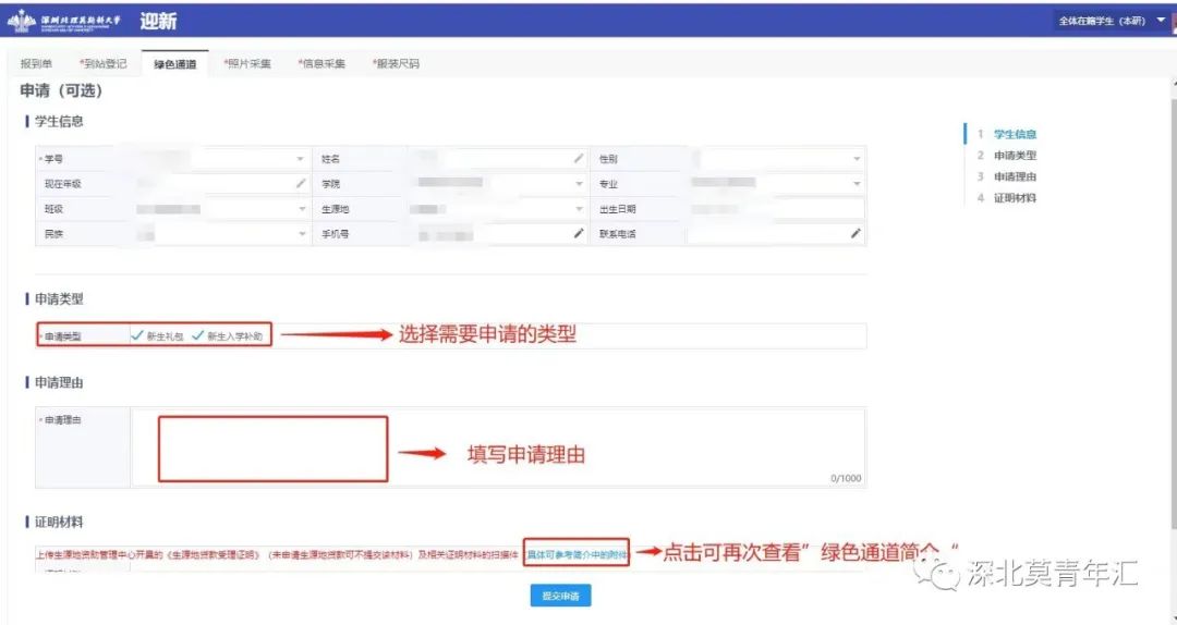点击“绿色通道”,请学生根据个人情况申请。如需申请,请填写并提交申请表。