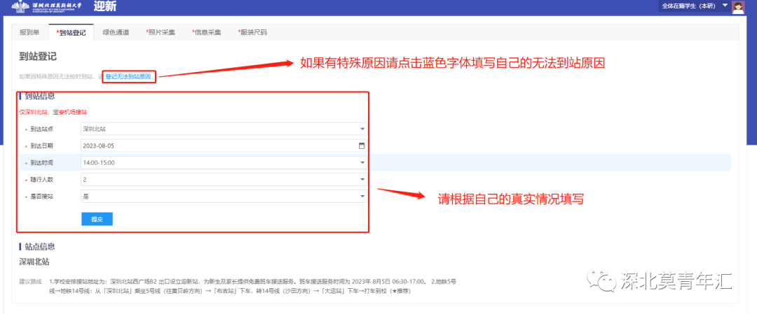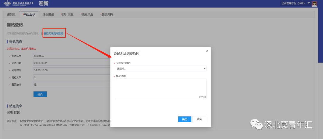 (1)点击“到站登记”菜单,登记到校站点、到达日期、到达时间和随行人数,提交审核。若因特殊原因无法到校,点击“登记无法到校原因”说明具体情况。