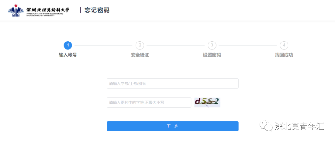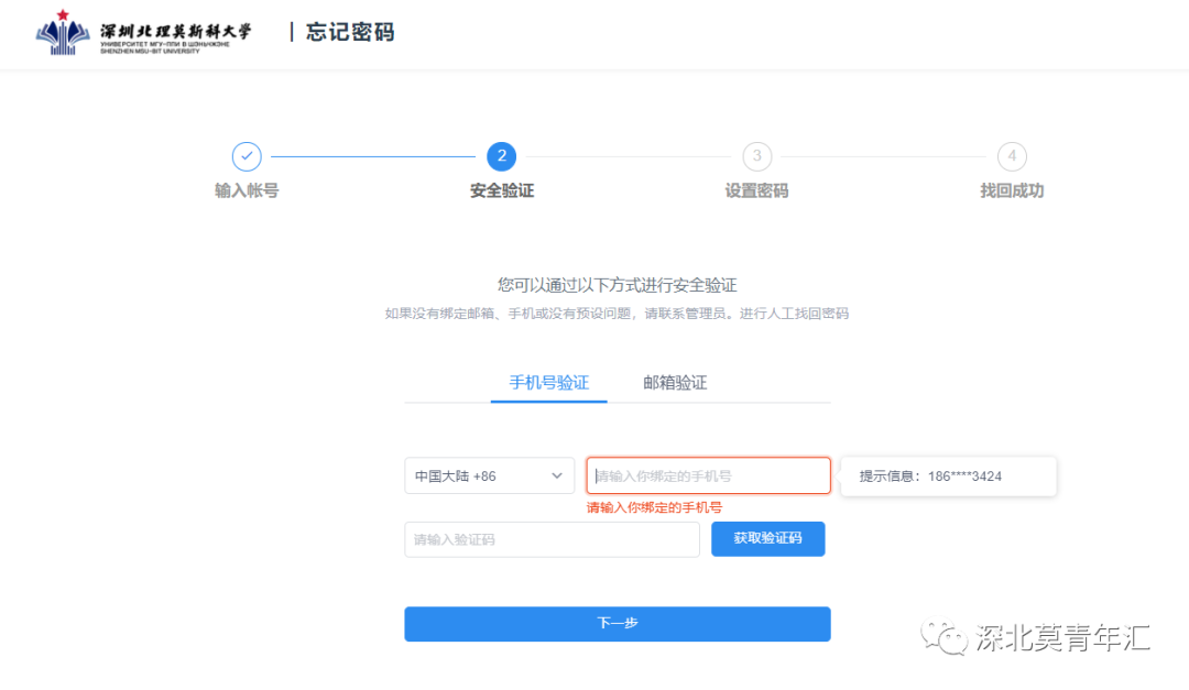 (2)进入“忘记密码”页面,输入账号和验证码,点击“下一步”进行安全验证操作。目前有“手机号验证”和“邮箱验证”两种方式,根据提示设置新密码。