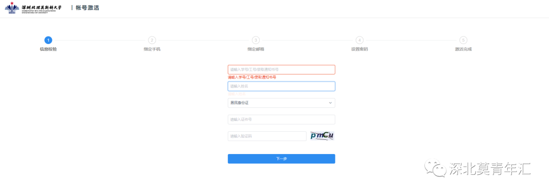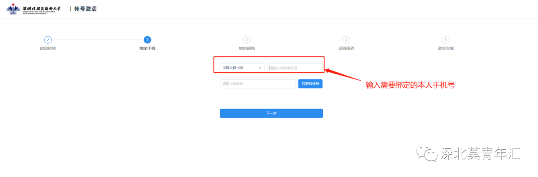 (2)在信息校验页面输入学生本人录取通知书号、姓名、身份证号和验证码,点击“下一步”按钮进入“绑定手机”环节。