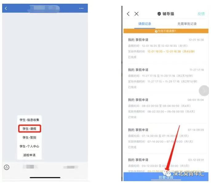 如需提交请假或者销假申请,请在工作台-“辅导员通知”中服务列表找到“请假”应用,并点击进入。