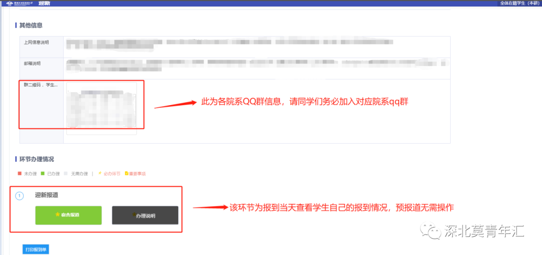 (2)报到单的环节办理情况:提供报到当天现场办理环节及流程情况,方便新生熟悉报到当日所需办理环节。