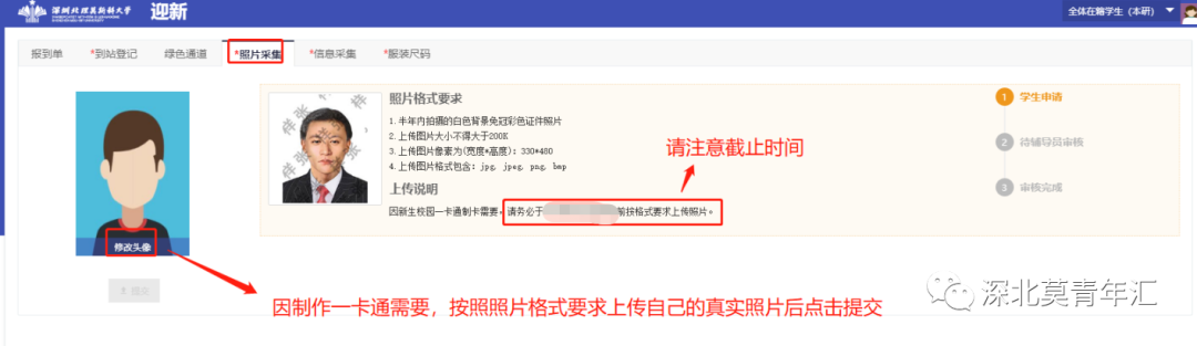点击“照片采集”菜单,收集校园一卡通照片。按照图片格式要求,上传个人真实照片后提交。因制作一卡通需要时间,请在8月1日23点前上传照片。