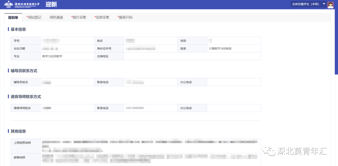 (1)方便学生查看自己报到情况。报到单包含基本信息、辅导员联系方式、德育导师联系方式、其他信息、环节办理情况等,打印报到单。注:新生关注的辅导员、住宿信息将在此页面展示。