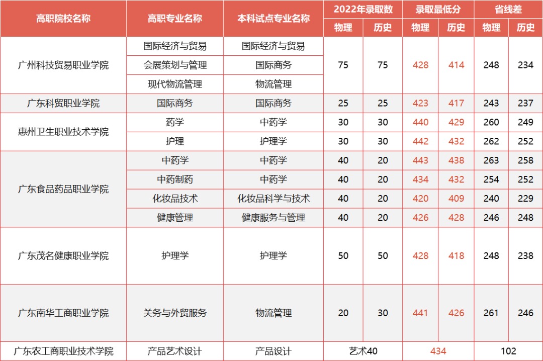 2023年我校分别与广东科贸职业学院、广东茂名健康职业学院、广东南华工商职业学院、广东农工商职业技术学院、广东食品药品职业学院、广东邮电职业技术学院、广州科技贸易职业学院、惠州卫生职业技术学院8所高职院校开展三二分段专升本协同育人项目,分别有国际经济与贸易、国际商务、物流管理、会计学、产品设计、软件工程、工商管理、金融工程、护理学、中药学、药学、化妆品科学与技术、健康服务与管理13个专业。
