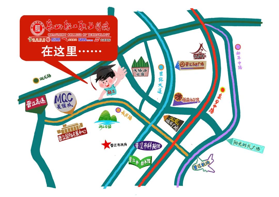 这么美的轻工你还不知道在哪里现在就告诉你学校位于晋江市区,坐落于博览大道北侧,周边高速公路、高铁、航空一应俱全,离高速出口约3公里,离机场约6公里,离晋江动车站约15公里,乘坐汽车到晋江长途汽车站,可搭7路、21路、34路、41路公交车抵校。
