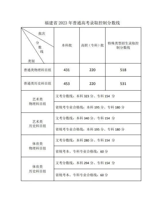 2023年福建省普通高考成绩已揭晓,各类录取控制分数线已确定,具体如下——