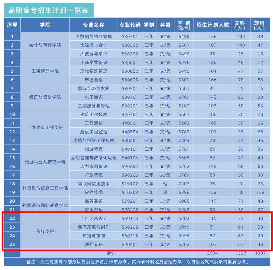 传媒学院于2020年5月设立,其前身为成立于2004年的文化与传播系。现开设网络与新媒体、视觉传达设计2个本科专业,新闻采编与制作、传播与策划、现代文秘、广告艺术设计、视觉传播设计与制作等5个高职专业,同时承担全校性公共课大学语文、应用写作课的教学任务,设新闻、艺术设计和语文等3个教研室,以及民族文化与传播研究中心。