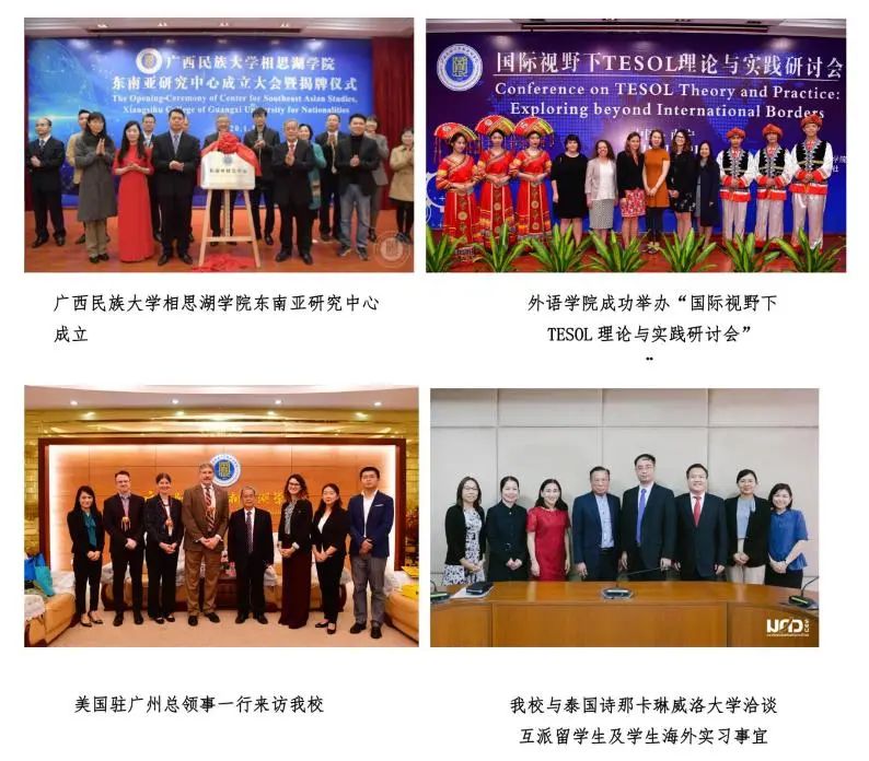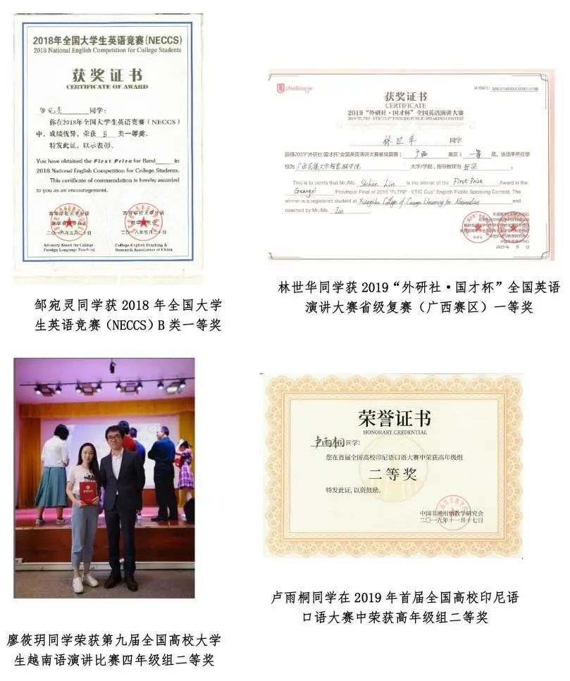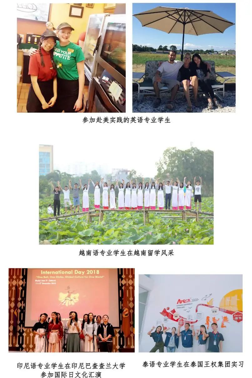 外语学院所有专业均为本科,学制四年,授予文学学士学位。实行“3+1”培养模式,与英国提赛德大学、马来西亚世纪大学、日本熊本学园大学、越南河内国家大学所属人文社会科学大学、胡志明市国家大学所属人文社会科学大学、泰国诗那卡琳威洛大学、清迈大学、印尼巴查查兰大学、印尼建国大学等国外院校建立了合作关系,三年级时学生赴对象国留学(实习)一年(英语、商务英语专业自愿报名出国学习,经审核符合条件的学生,可到马来西亚、英国、日本、泰国学习一年。)此外,外语专业学生还参加暑期赴美实践等活动,开阔了国际视野。