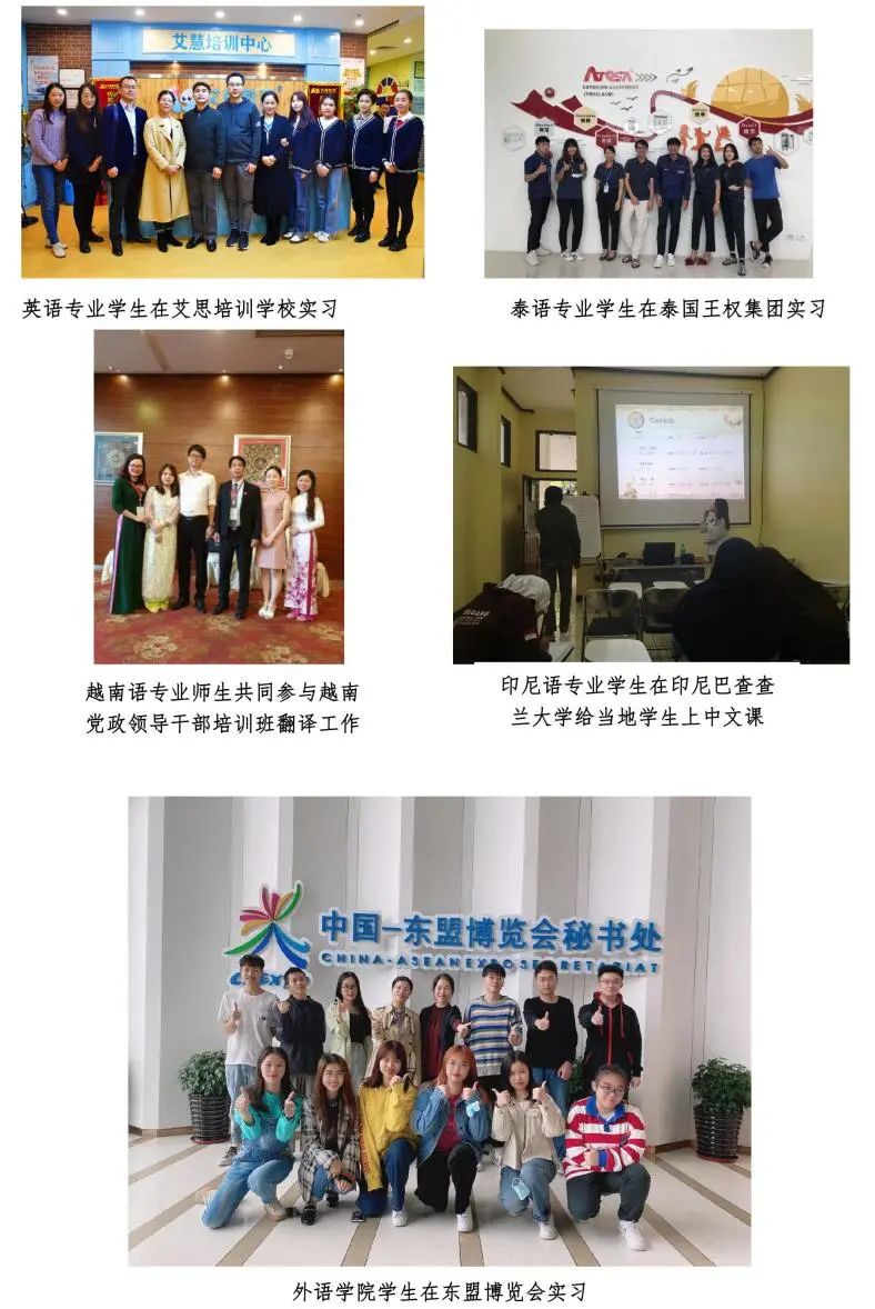外语学院个专业的主要实践性教学环节包括专业课程实习、中国——东盟博览会课程见习、毕业实习、毕业论文(设计)、创新创业项目、暑期赴美实践项目、外语文化活动月、学科竞赛等,使学生将理论知识更好地转化成自身解决问题的技能。