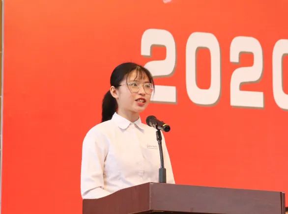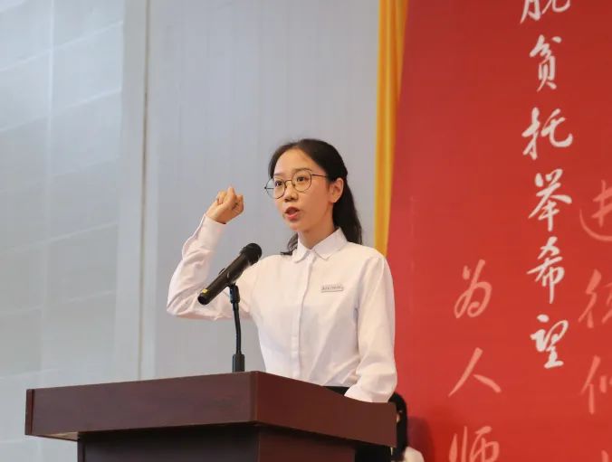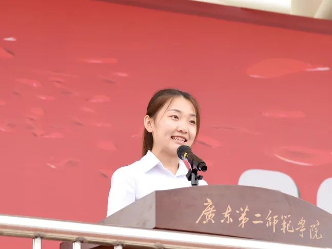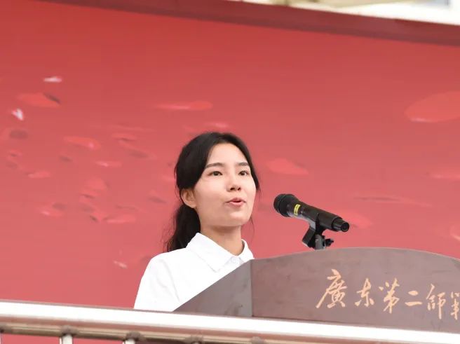郑骊誉作为新生代表上台发言。她引用“90后”“00后”们正在用自己的实际行动,回应那些曾经模糊了他们真实面目的标签的例子,肯定了自己身为青年的责任与担当。她倡议大家要树立远大理想,勇于砥砺奋斗。要做好每一件小事、完成每一项任务、履行每一项职责。与此同时,练就过硬本领。她说:“作为一名师范生,我们更应担当时代的神圣使命,珍惜韶华、炼就过硬本领,锻炼师范生技能,使自己的思维视野、思想观念、认识水平跟上越来越快的时代发展。”