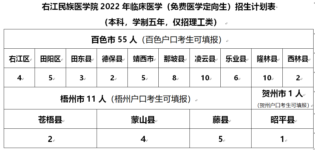 农村订单定向医学生(以下简称定向医学生)免费培养项目是国家发展改革委、国家卫生健康委、教育部、人力资源和社会保障部、财政部和国家中医药管理局等部门联合启动实施,重点为乡镇卫生院及以下医疗卫生机构培养从事全科医疗的卫生人才,加强以全科医生为重点的基层医疗卫生队伍建设,为健康中国建设提供人才支撑的一项重要举措。2022 年,右江民族医学院继续承担定向医学生免费培养项目,面向百色、梧州、贺州生源招生(户籍在百色、梧州、贺州的考生),订单定向免费五年制本科医学生共计67人(详见计划表)。