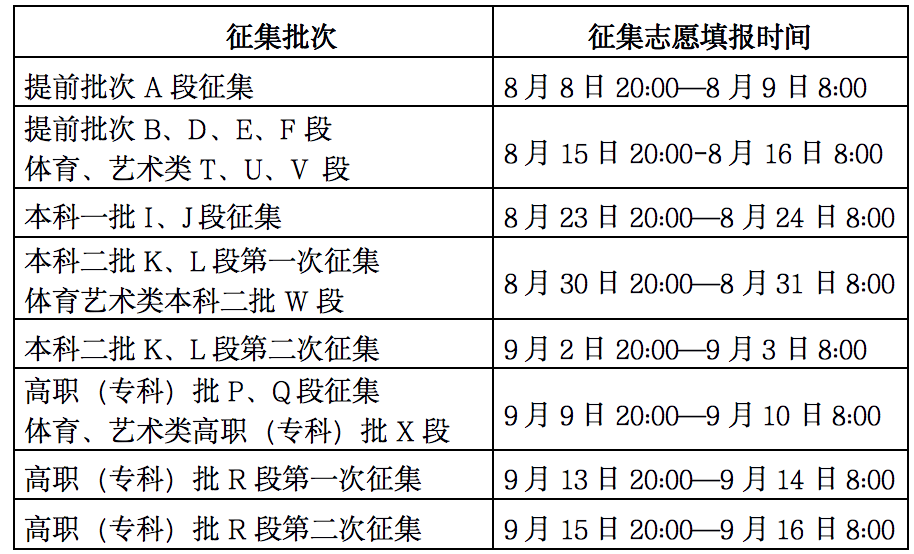 本科提前批A段、 B段、C段、D段、E段、F段、G段,本科一批H段、I段、J段,本科二批K段、L段,高职(专科)批P段、Q段,体育、艺术类本科一批(T段、U段、V段),体育、艺术类本科二批(W段)。