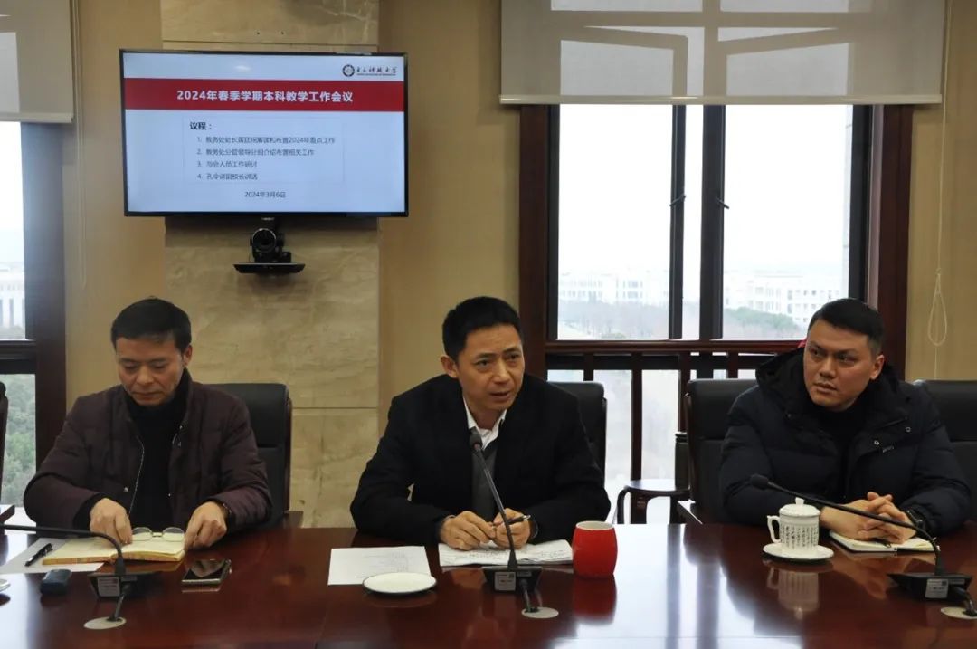 教务处副处长覃庆国、黄艳、王子南和本科招生办公室主任林鹏先后介绍了教学运行、教改教研、实践教学和本科招生等方面的重点工作安排。与会人员就本科教学相关工作进行了交流讨论。