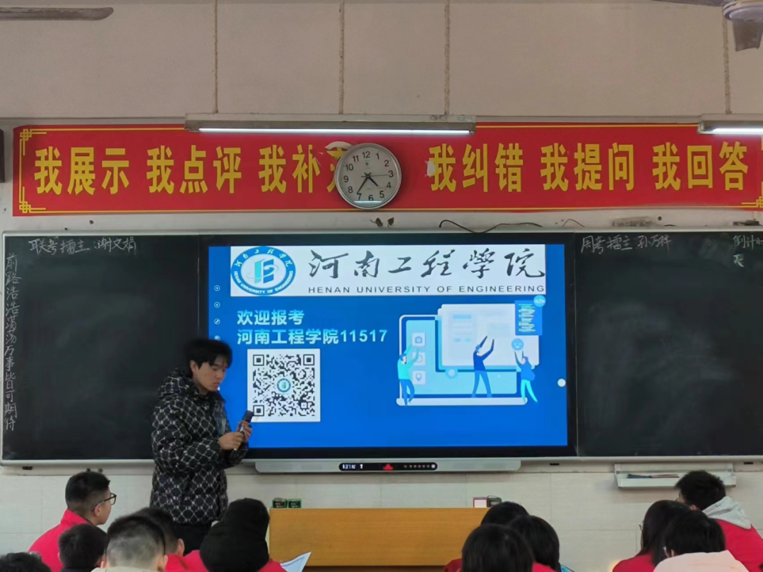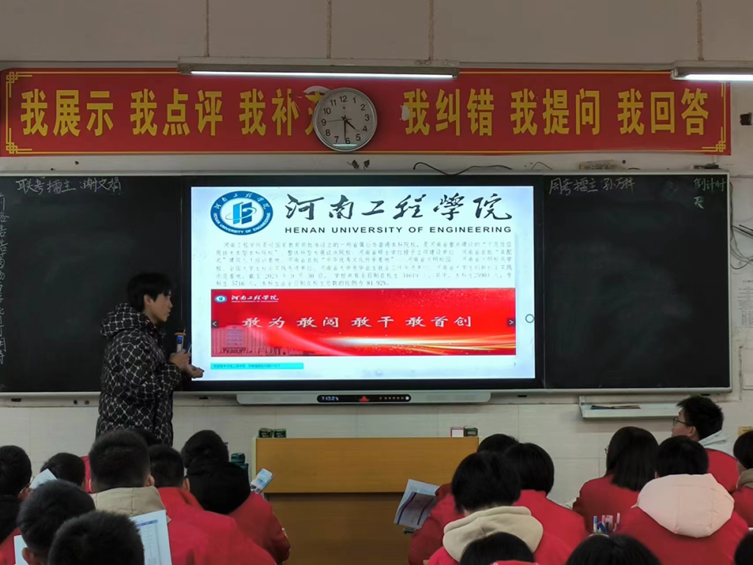 把事先准备好的PPT打开,然后进行了自我介绍和此行的目的,之后开始介绍河工的特色专业、师资力量、校园风光、以及招生信息等。我们还向同学们展示了河工的美景:高大雄伟的图书馆、明月湖、怀若谷、情人坡.....同学们被河工美景深深吸引,欢呼声不断,我还提问同学们抗日英雄杨靖宇是哪个学校的,我自豪地说,他就是咱