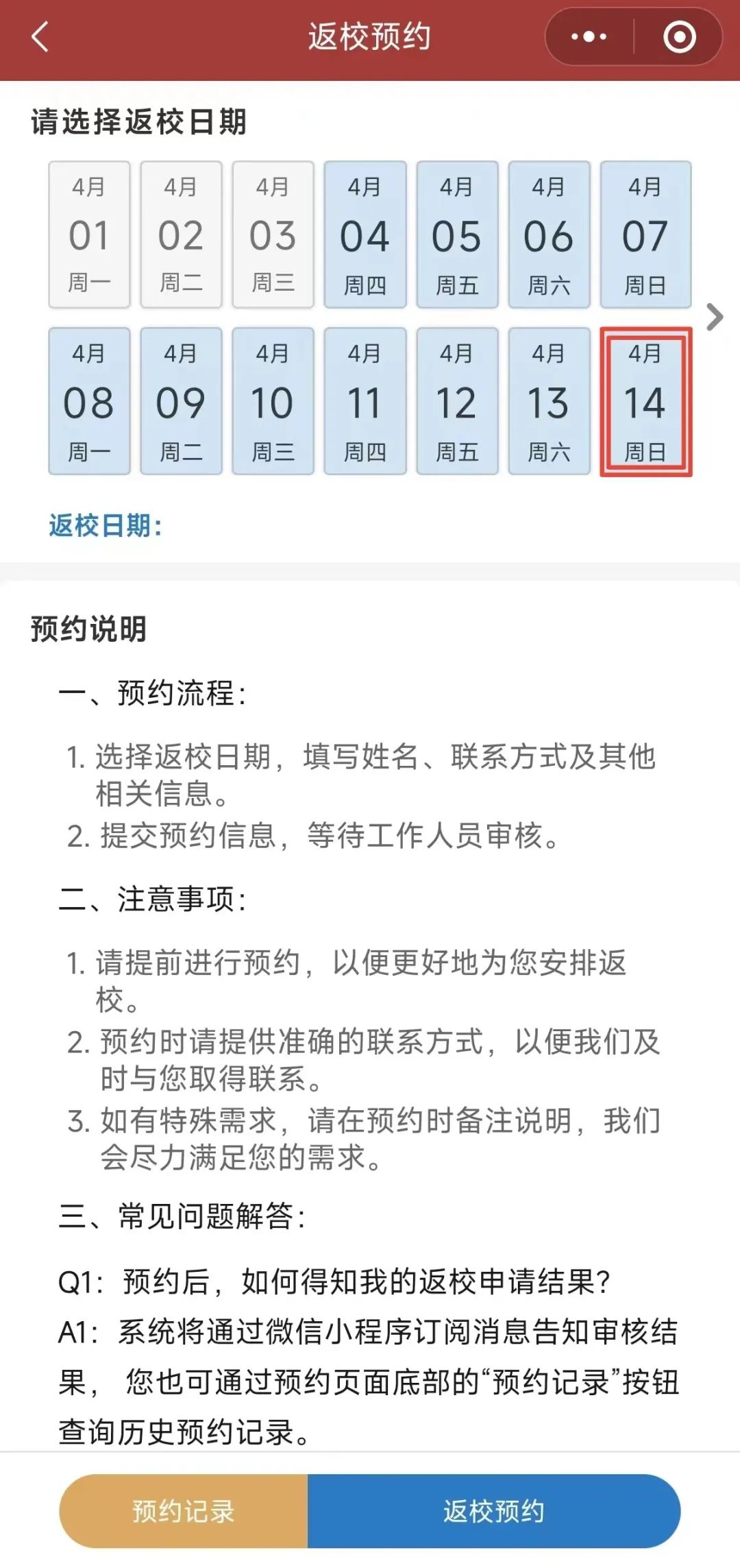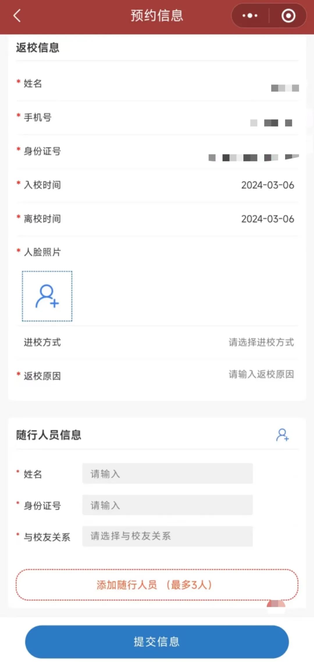 1、选择返校日期,填写姓名、联系方式及其他相关信息;