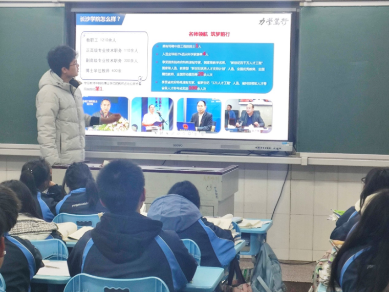 重回母校是拜见恩师、分享经验、宣传大学的好时机,“先锋队”的成员们用精心准备的PPT、照片和视频展示了长沙学院的美丽校园和多彩生活。他们从长沙学院的建校历程、基础建设、发展规划讲到了优美的校园风景、优越的地理位置、舒适的住宿条件;从雄厚的师资力量、先进的科研成果、丰硕的竞赛奖项讲到了良好的学习条件、丰富的校园生活、高质的发展平台,多角度展现了大学学习生活的方方面面,带领同学们感受长沙学院的魅力。