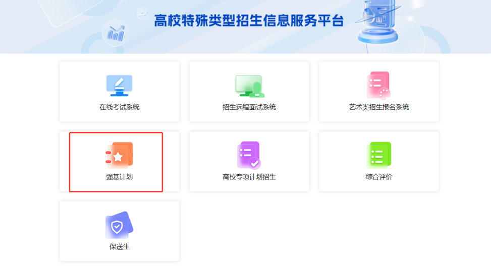 考生首次登录平台,需要先进行账号注册,注册成功后才能登录。登录成功后,考生可点击页面左侧的“特殊类型招生信息服务平台”,选择“强基计划”对应的报名入口,再选择“强基计划试点高校报名入口”。