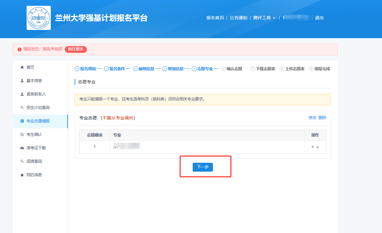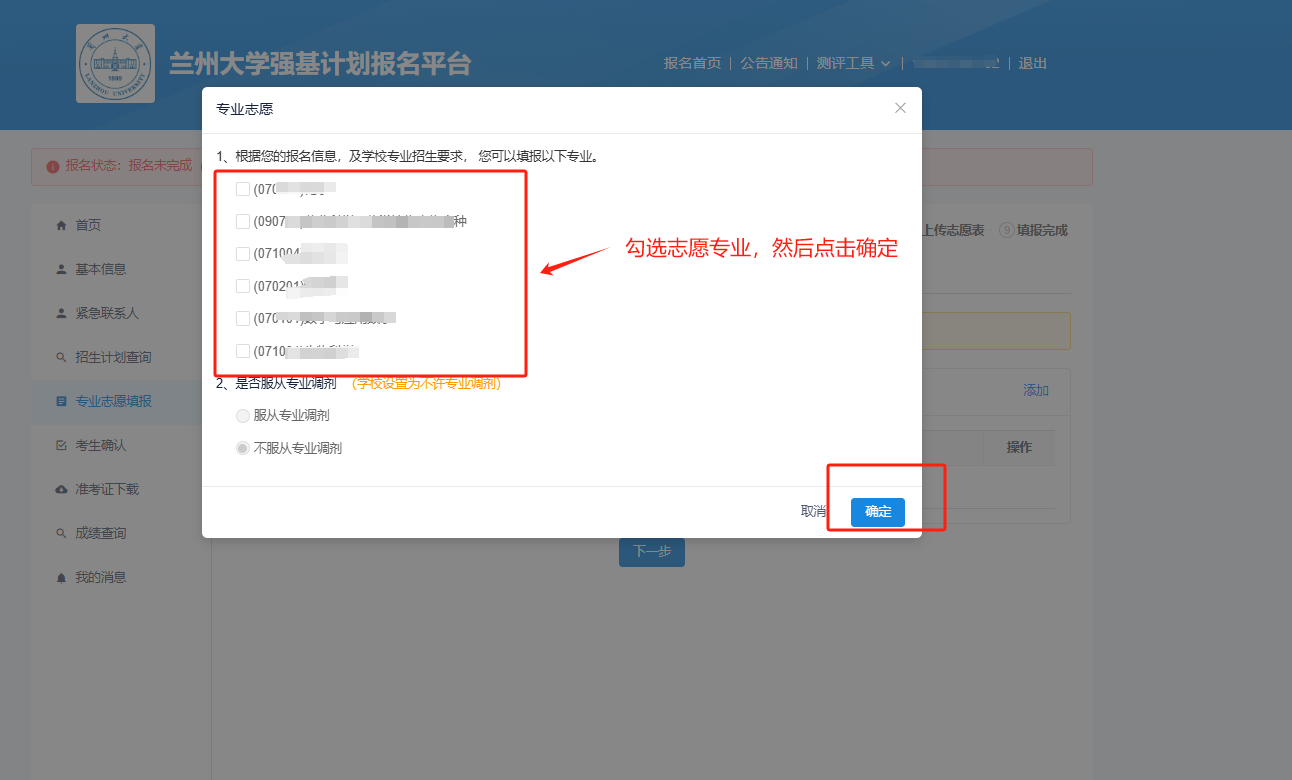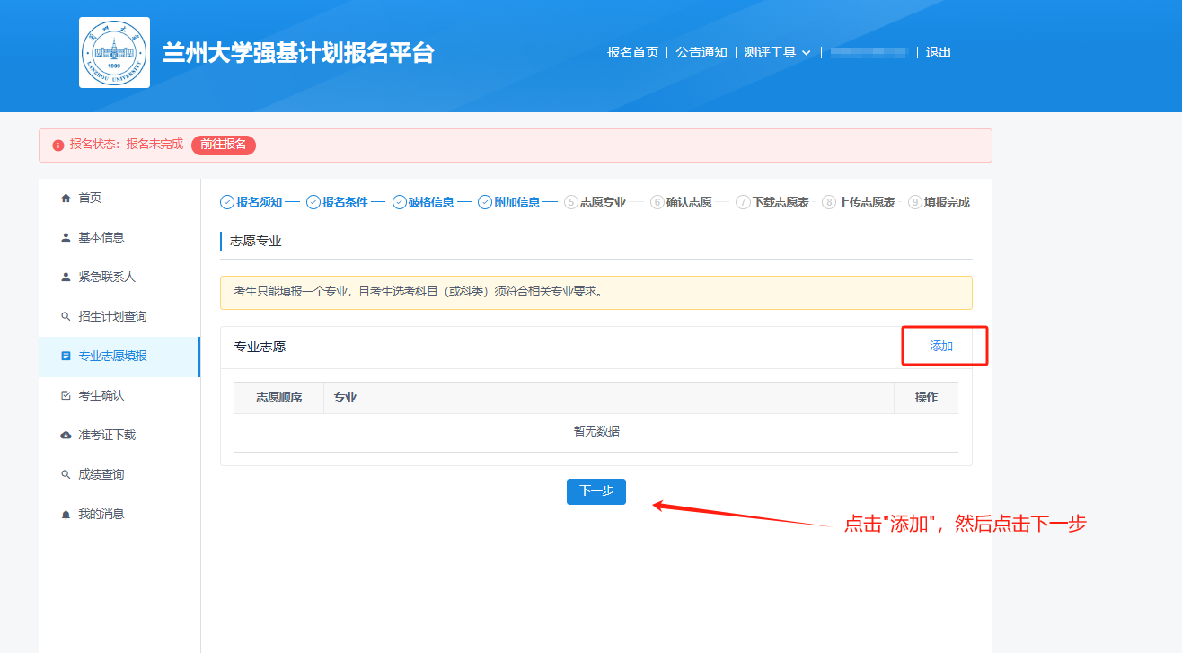 点击“添加”,勾选志愿专业,然后点击确定,然后点击下一步。