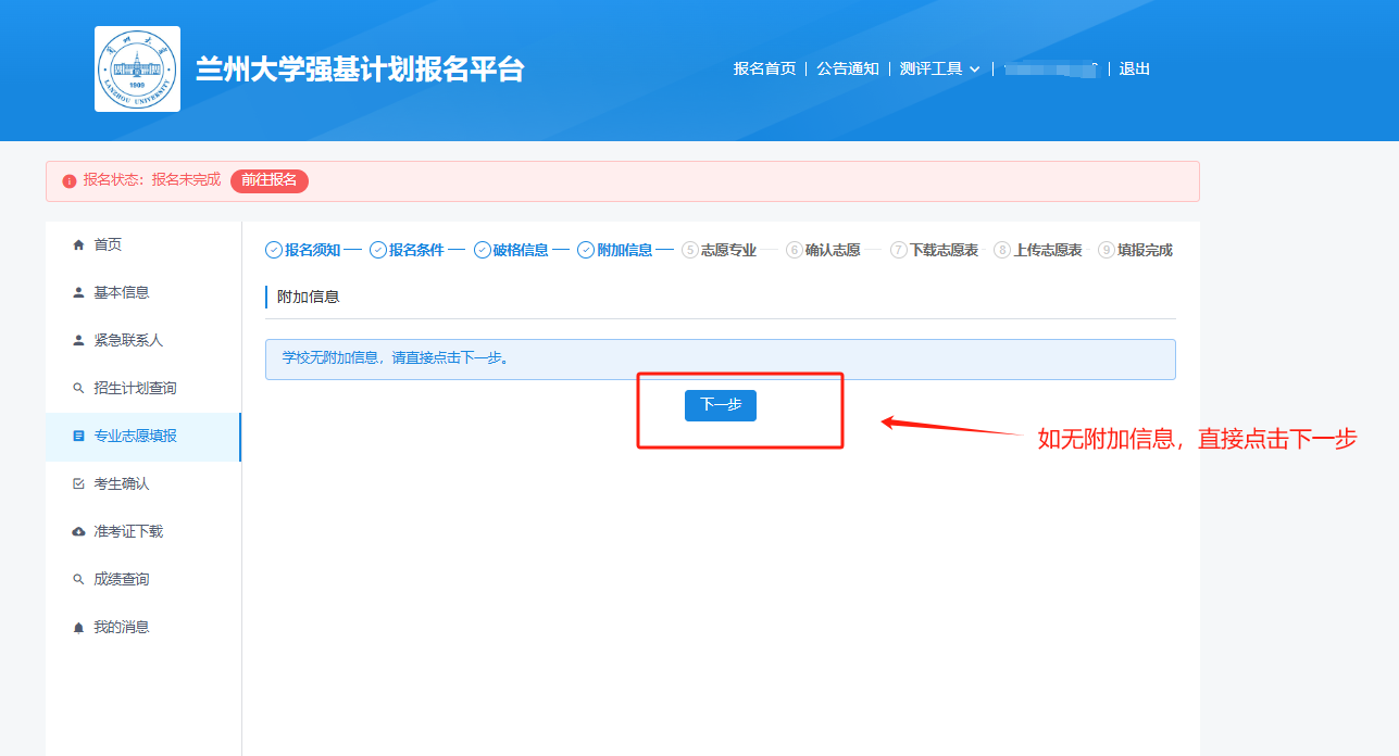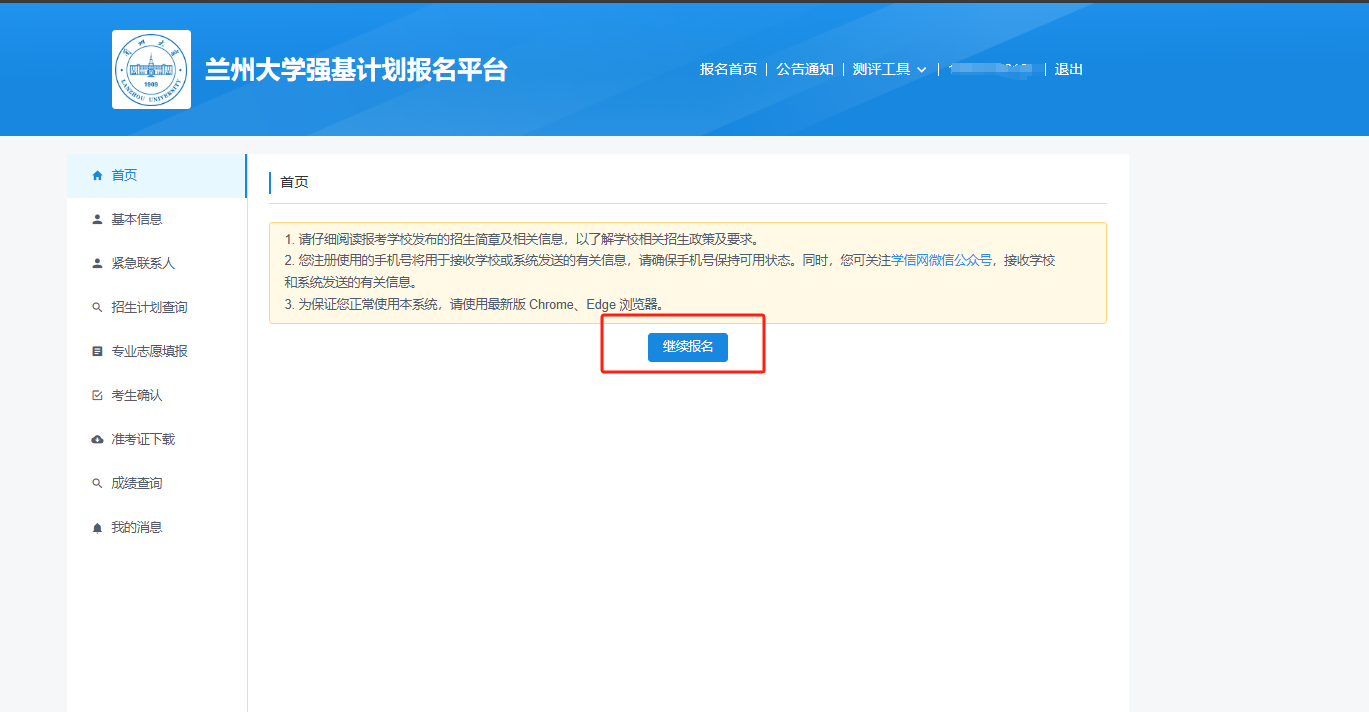 3.确认基本信息:进入报名系统,阅读首页须知后,点击“继续报名”。