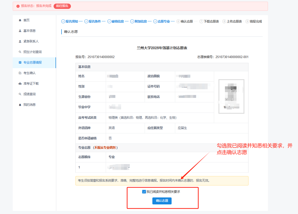 勾选“我已阅读并知悉相关要求”,并点击“确认志愿”。