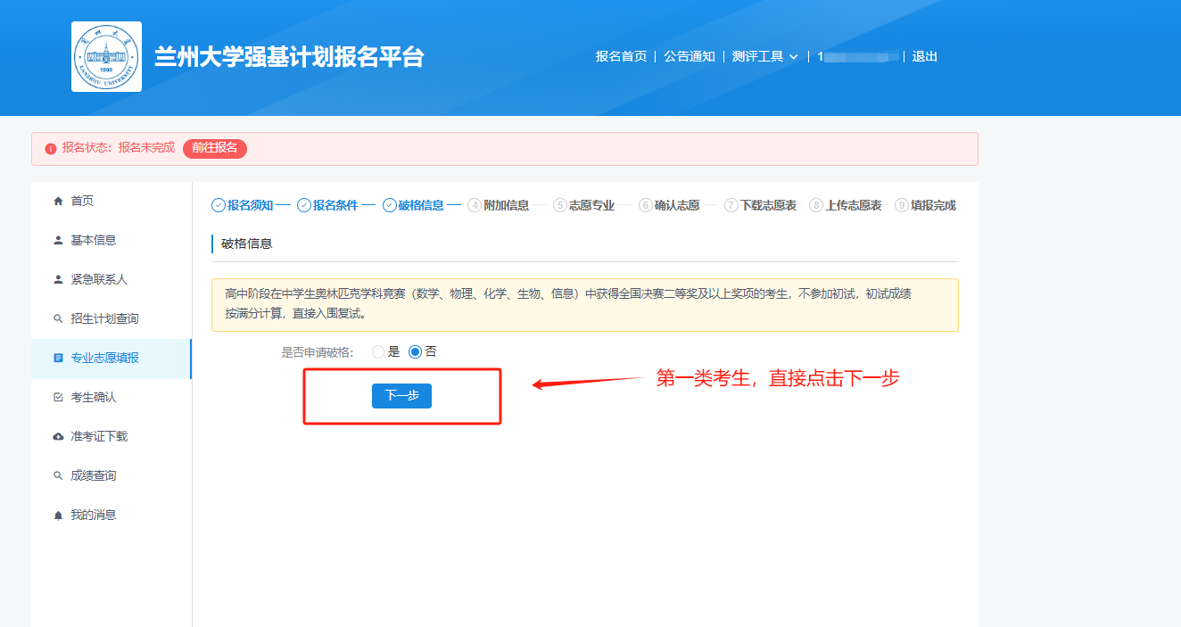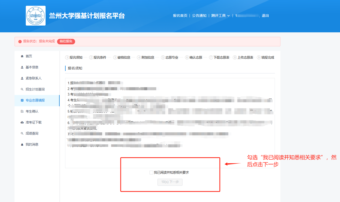 (2).阅读报名须知,勾选“我已阅读并知悉相关要求”,然后点击下一步.