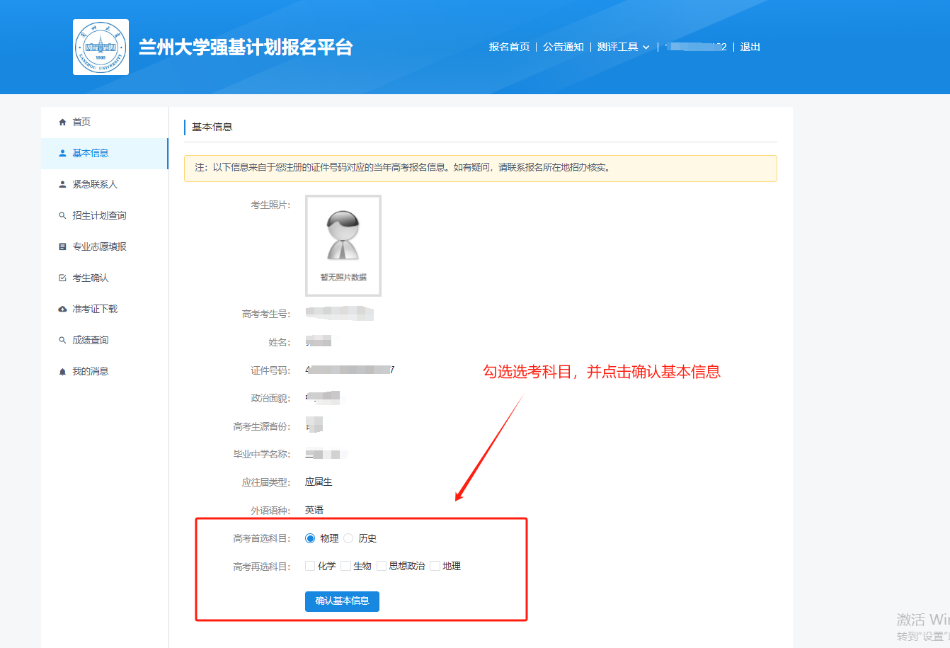 核对“报名基本信息”页面显示的信息。高考改革省份的考生还需勾选选考科目。