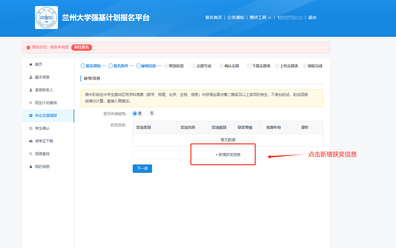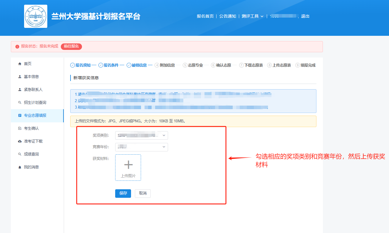 第二类考生需填写新增获奖信息,勾选相应的奖项类别和竞赛年份,然后上传获奖材料。