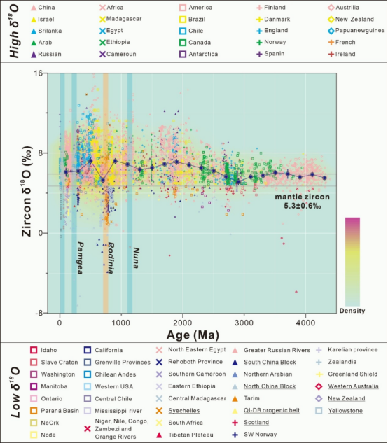 本文收集了全球已发表的13,500个锆石的氧同位素