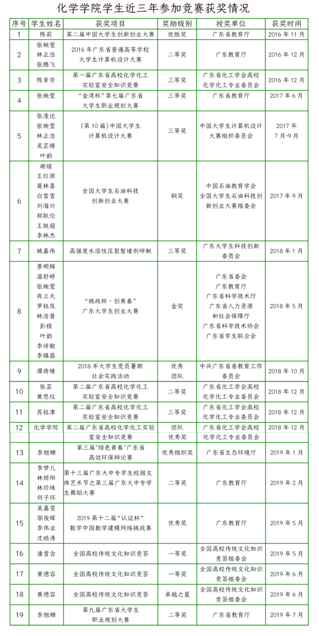 近三年,化学学院学生参加各类竞赛获奖共19项,其中国家级8项,省级11项。公开发表学术论文33篇,申请各类专利5件,主持科研项目共计53项,其中国家级项目7项,省级22项,校级24项。