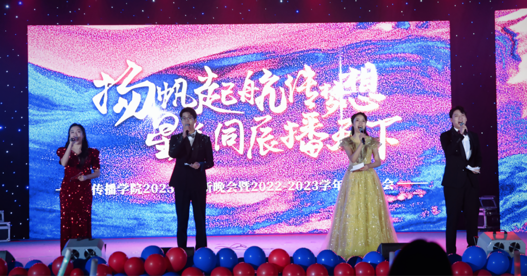 2023年12月22日晚,传播学院2023年迎新晚会暨2022-2023学年表彰大会于图书馆大礼堂拉开序幕。潇洒自如的舞蹈,饱含深情的朗诵,优美动人的歌曲串烧,温暖感人的合唱,传院学子如朝阳般热烈明媚,意气风发;炫酷的街舞,惟妙惟俏的配音秀,华丽的古典舞,传院学子立志肩日月星天。穿插于节目中的表彰大会,更是传院学子揽星衔月逐梦想的生动写照。未来,传院学子仍将乘风踏浪,比肩日月星光!