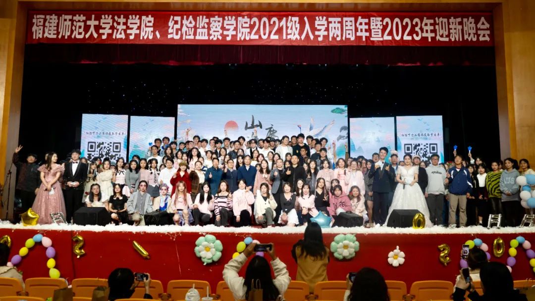 2023年11月30日晚,法学院,纪检监察学院题为“星光璀璨,廌向未来” 2021级入学两周年暨2023级迎新晚会在青春剧场举行。晚会以欢快热烈的舞蹈《feel special》开场,现场气氛迅速燃起。观看晚会如饮清茶,三个主基调——廌山海;廌星途;廌未来串联起整场晚会,浓香氤氲,余韵悠长。晚会形式多种多样——相声、小品令人捧腹大笑;诗朗诵、合唱节目、话剧展现青年熠熠风采;歌曲、乐队、舞蹈更是带动全场气氛。山海归期路漫漫,星河璀璨万丈光,期待法学院学子接过火炬,“廌”启征程!