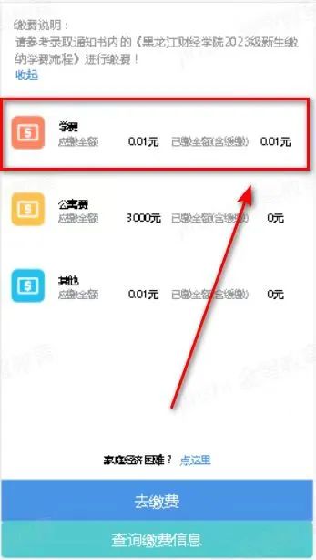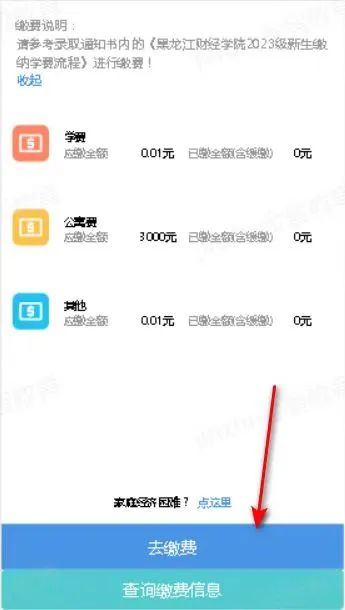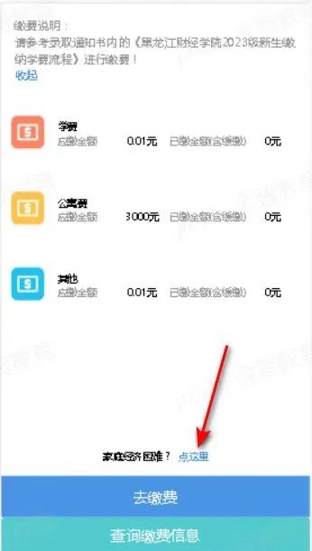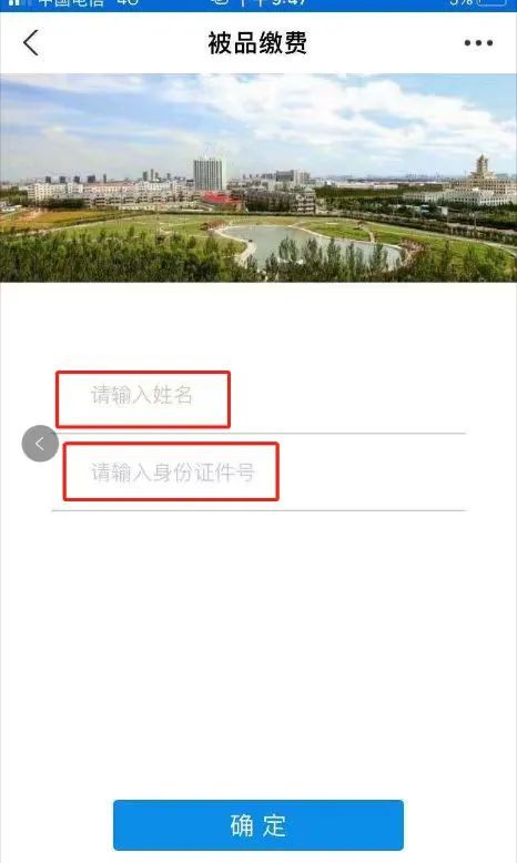 输入学生姓名和身份证号,点击确定。进入被品缴费页面。