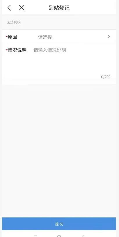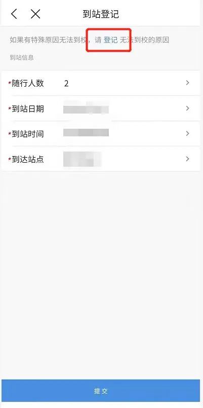 点击到站登记如下图,进入到站登记,填写随行人数,到站日期,到站时间,到达站点提交即可。学校在相关站点有接站人员和到校指南。如无法按时到校,请登记原因,并通过“今日校园”应用提交申请,申请后及时与学院辅导员老师联系确认。