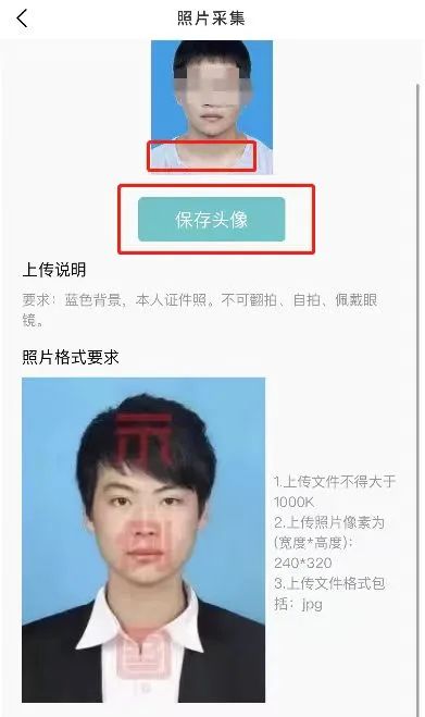 点击照片采集如下图,照片需上传未精修的蓝底免冠照片,上传后需点击保存头像。用于入学后的各类证件制作,请按照要求认真操作。照片上传后,审核不通过,会有消息提醒,注意查看。审核不通过,需要重新上传照片。