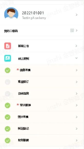新生需要完成信息采集、商品预定、在线选房、军训服装、照片采集、到站登记、