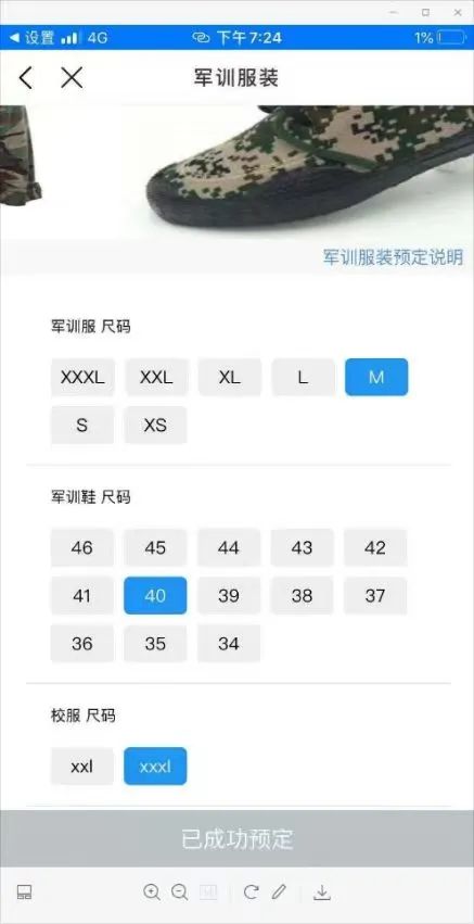 点击军训服务如下图,选择对应尺码进行预订,包含军训服,军训鞋,校服,点击确定。