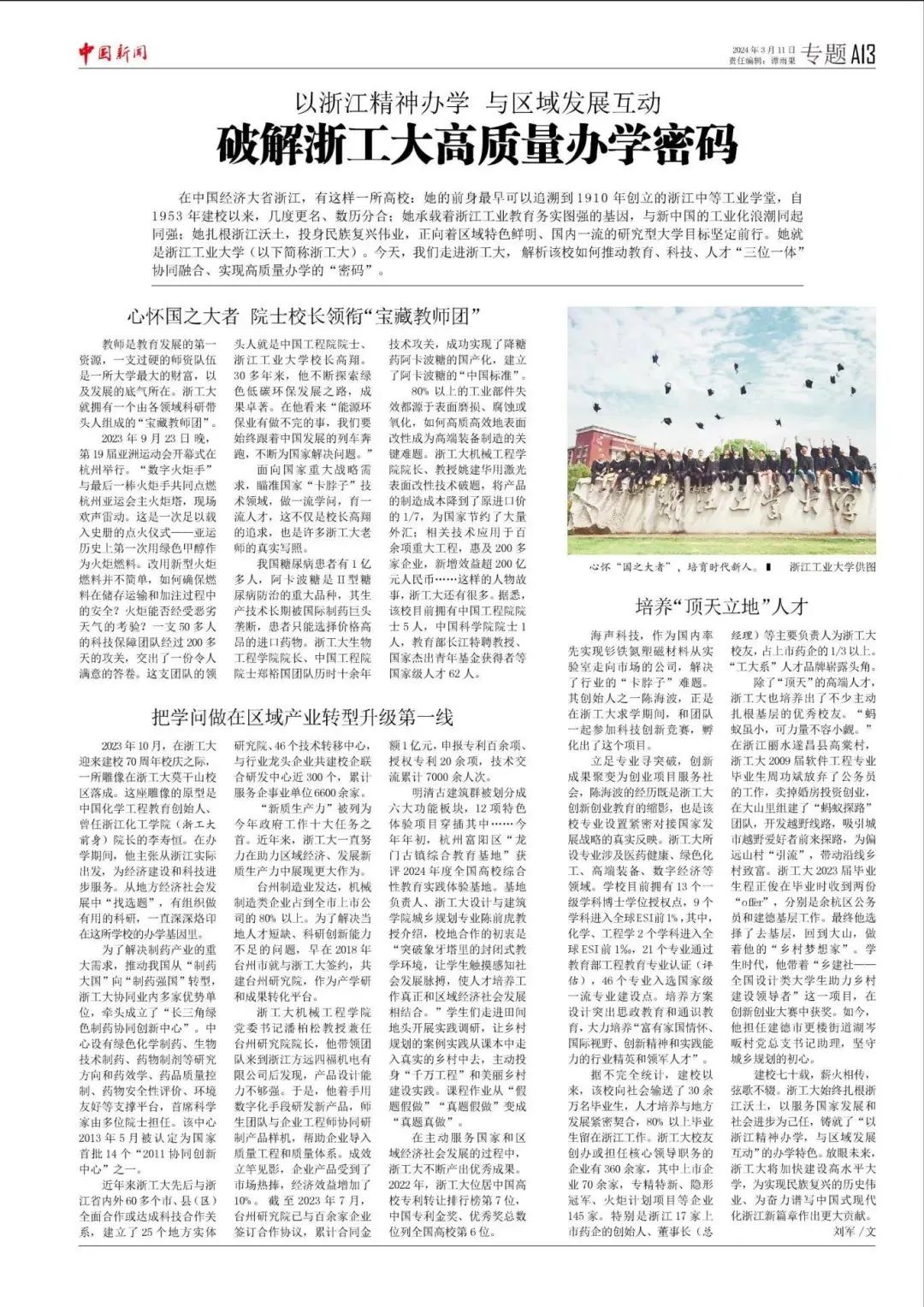 3月11日,《中国新闻》报以《以浙江精神办学,与区域发展互动——破解浙工大高质量办学密码》为主题,专版报道浙工大如何推动教育、科技、人才三位一体协同融合、实现高质量办学的“密码”。