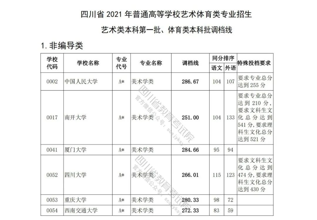 我省2021年艺术本科第一批与体育本科批已于7月20日投档录取。为方便广大考生和家长及时了解录取信息,省教育考试院按非编导类和编导类发布了艺体类分校、分专业类调档线。