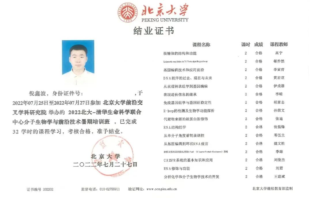 除了专业知识的学习,他注重全方位发展,科研实验、社会实践、志愿服务、文体活动都有他身影,多次在各类考试和比赛中取得骄人成绩,在不断磨砺与锻炼中收获全面成长。在寒暑假,他从全国众多大学生中脱颖而出,入选参加北京脑科学与类脑研究中心、北大清华生命科学联合中心等多所顶尖高校主办的冬令营和暑期培训,在一次又一次挑战自我的尝试与实践中,进一步了解学科前沿,找到了自己的航向。
