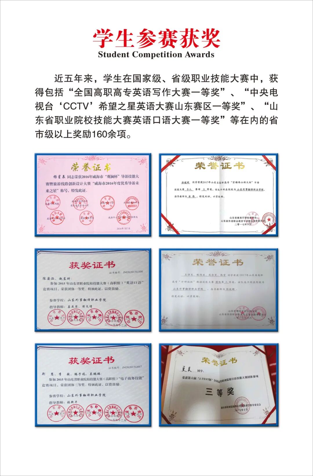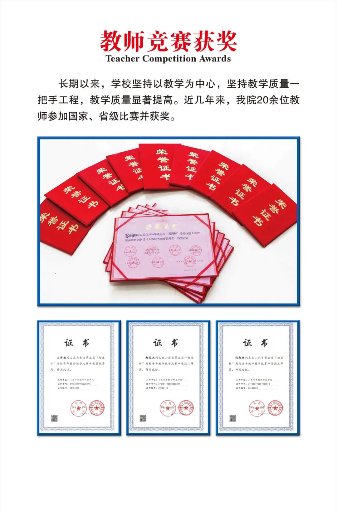 ◆学校不断加强校园文化建设,各种学术、文体活动丰富多彩。学生在国家和省级各类专业技能大赛中获得各类奖励752项,其中国家级奖104项。近五年来,毕业生就业率均保持在96.5%以上。由于管理规范、办学成绩突出,学校先后获得“全国诚信示范院校”“最受欢迎的本科院校”“山东省高等学校教学管理先进集体”“山东省5A级社会组织”等荣誉称号,校长孙承武教授荣获国家“黄炎培职业教育奖杰出校长奖”。