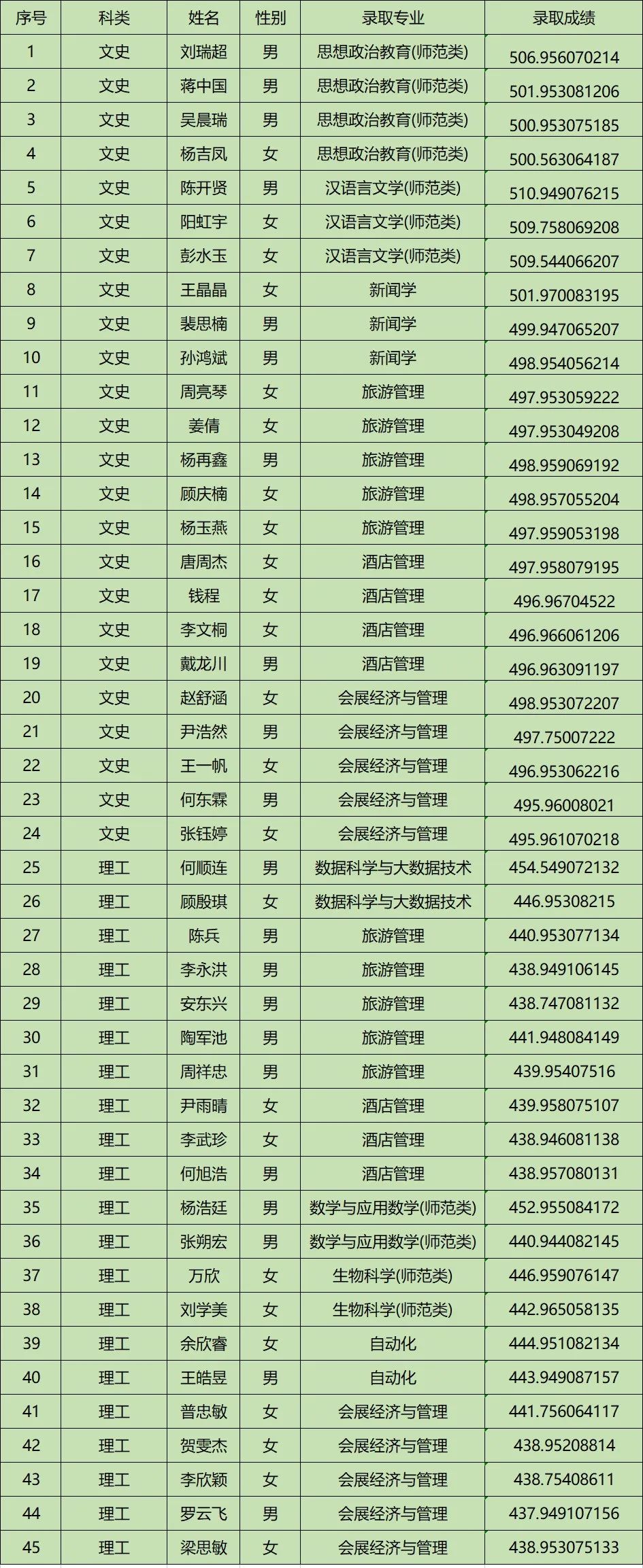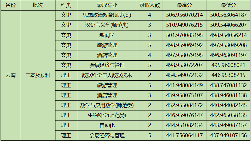 晋中学院2023年云南省二本及预科录取名单